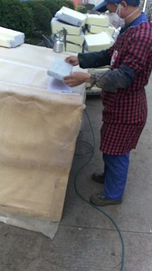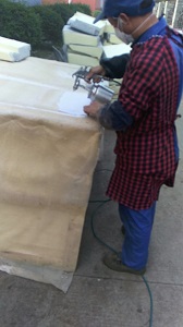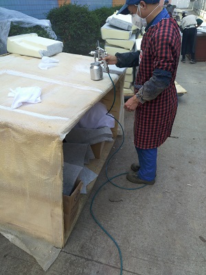 第三代单组份环保水性喷胶因其环保无毒、一粘即合、雾而不化,并且耐高温80℃、防火去静电、无味零VOC等特点。广泛应用于汽车座椅、转椅、高档枕头、床垫、厚皮沙发、布艺沙发、屏风、手袋以及皮具等软体家私的制造。适合于海绵、厚皮、仿皮、布艺、再生皮、木材等材料的粘接。随着国家加大环保执法力度和人们环保意识的逐步增强,水性环保漆的应用必将有更广阔的市场。下图是单组份水性环保漆在座椅上的应用现场。